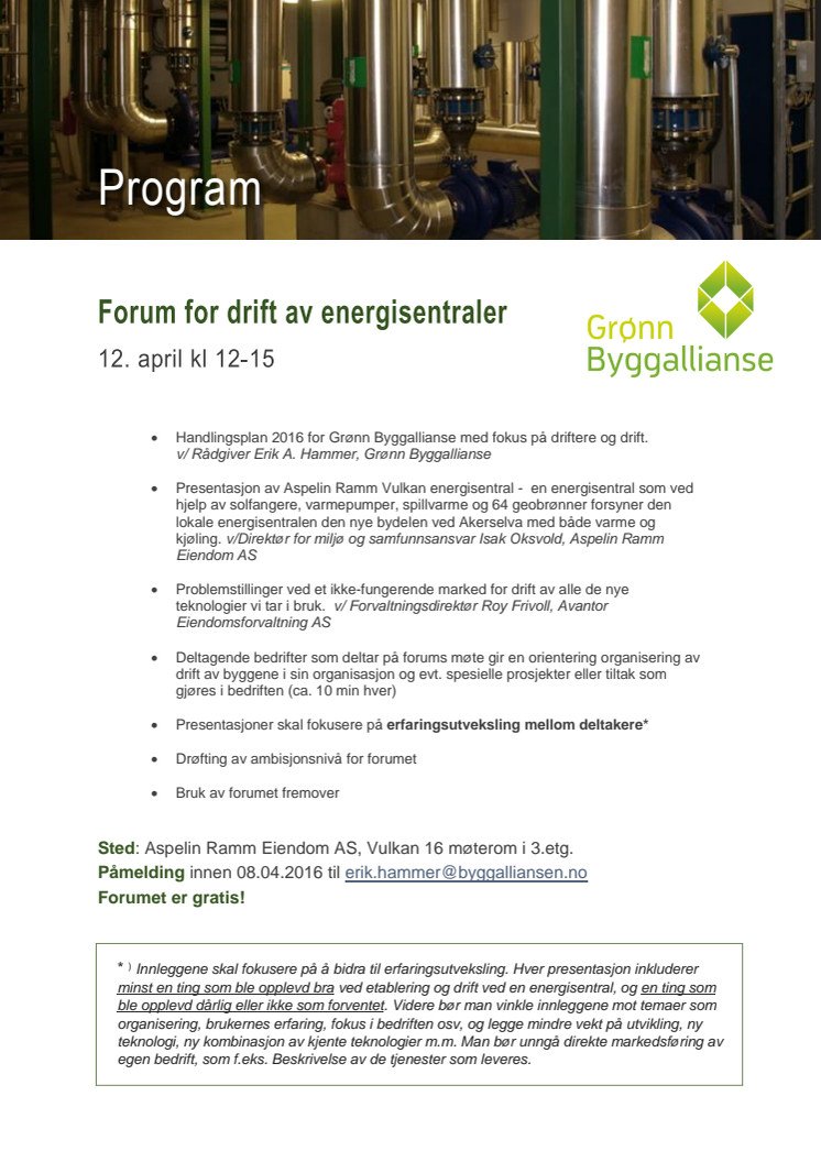 Det etableres alt fler energisentraler av utbyggere, hvilket kan lede til utfordringer ved driften. Dette forum har som hensikt å få til et samarbeid mellom forskjellige aktører. Første møte blir hos Aspelin Ramm på Vulkan, der vi bl.a. vil bli orientert om energisentralen der, som ved hjelp av solfangere, varmepumper, spillvarme og 64 geobrønner forsyner bydelen med både varme og kjøling.