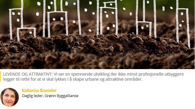 Vi ser en spennende utvikling der ikke minst profesjonelle utbyggere legger til rette for at vi skal lykkes. Mange byggeiere ønsker å gi noe tilbake til byen. Avantors utvikling av Nydalen og Aspelin Ramms utvikling av Vulkan i Oslo er gode eksempler på hvordan private utbyggere omdanner gamle industriområder til levende, urbane, attraktive byområder med kombinasjon av bevaring og nybygg, kombinasjon av bolig, kontor og handel, lokale utslippsfrie energiløsninger og bygg med høye miljøambisjoner. Høegh Eiendom er også godt i gang med høye miljøambisjoner for utvikling av Hasle Linje.