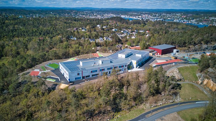 Roligheden skole i Arendal er et fremtidsrettet bygg på toppen av en flott utsiktstomt. Energibrønner, solcellepaneler og energieffektiv belysning sørger for et lavt energibehov.